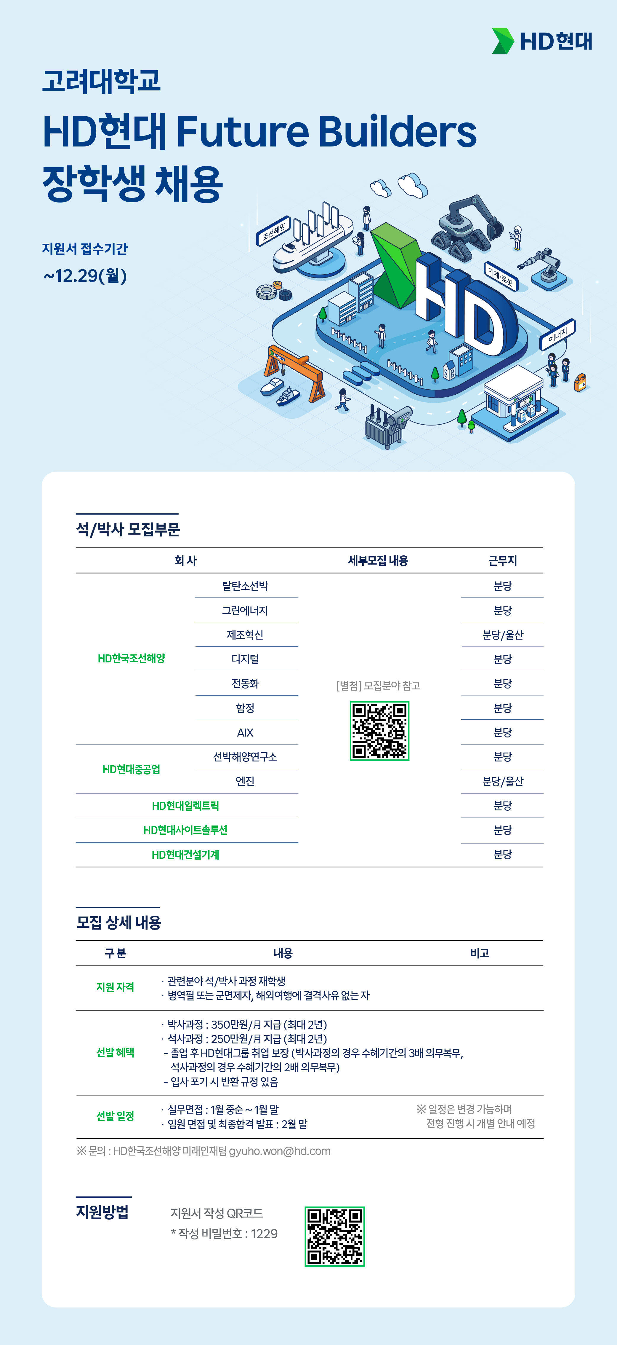 2026 HD현대 장학생 채용 런치설명회 및 상담회 🗓️ 고려대학교 12월 2일 (화) - 런치설명회 : 하나스퀘어 멀티미디어룸 (12:00~13:00) 🍔 설명회 사전신청자 대상 햄버거 SET 증정 🔗 런치설명회 사전신청 : https://m.site.naver.com/1W29s 2026 HD현대 'Future Builders 장학생 채용' ✅ 선발혜택 : - 박사과정 350만원 (월 지급 / 최대 2년) - 석사과정 250만원 (월 지급 / 최대 2년) |
